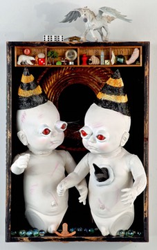 18X24 clay slip cast, taxidermy eyes and crow, found objects, toys